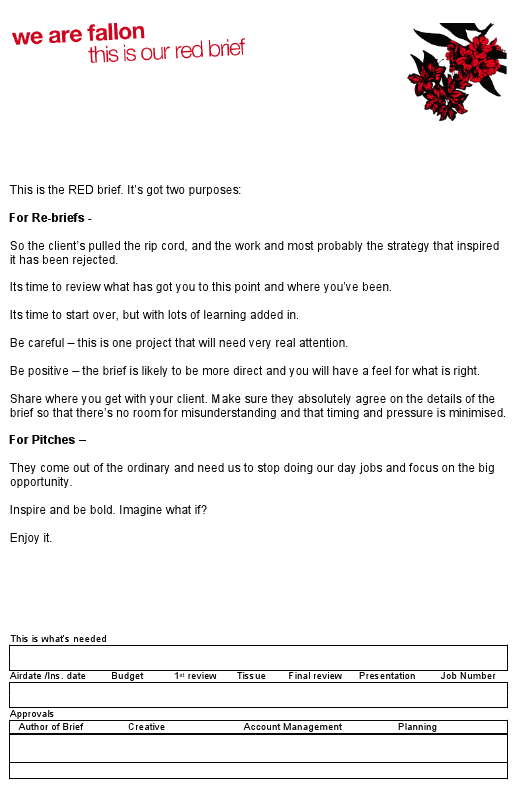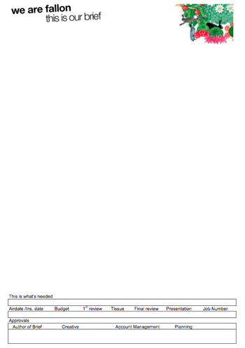 Как и сеть Saatchi & Saatchi, агентство Fallon придерживается концепции «голого» брифа. В агентстве полагают, что «хороший шаблон брифа» — это оксюморон, и все эти необходимые для заполнения поля — ерунда, засоряющая нежные умы креативщиков. Единственный минус подобного брифа — его качество сильно зависит от того, кто его заполняет.