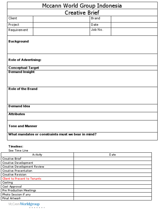 Бриф индонезийского МакКенна более подробный, чем прочие представленные здесь, но все равно умещается на двух страницах. Отдельно в нем расписаны все этапы работы и утверждения — для составления плана времени.