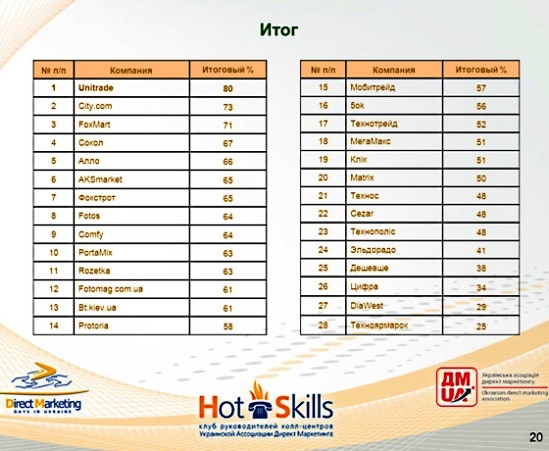 Наконец-то владельцы и руководители интернет-магазинов смогли объективно оценить уровень качества телефонного обслуживания своих клиентов. Это стало возможно благодаря озвученным Денисом Любивым, генеральным директором Contactis, Марией Романенко, аналитиком Украинской ассоциации директ маркетинга, результатам  первого исследования качества телефонного обслуживания интернет-магазинов, магазинов бытовой техники и электроники.