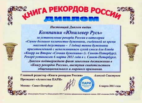 Полностью тонна мяса была съедена через 3 часа 45 минут после начала мероприятия. Эксперты "Книги рекордов Росси" немедленно зафиксировали результат и выдали каждому участнику специальный сертификат об установлении рекорда в народной дегустации буженины от Knorr.