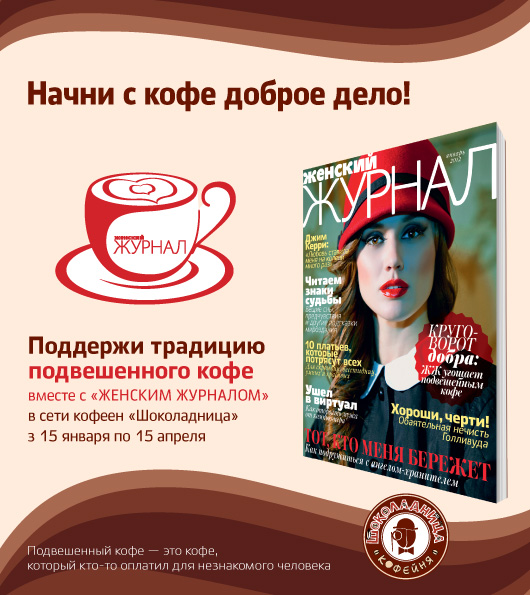 С 15 января до 15 апреля Женский Журнал совместно с сетью кофеен «Шоколадница» проводит кампанию под девизом «Начни с кофе доброе дело». Ежедневно в каждой из 11 киевских кофеен появляются пять «подвешенных» чашек от Женского Журнала.
