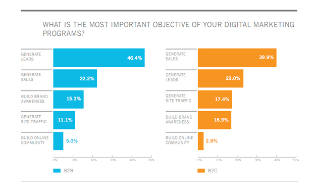 Для B2C-маркетологов продажи выходят на первое место по важности (39,9%). Меньшей значимостью обладают лидогенерация (23%) и генерирование трафика (17,4%).