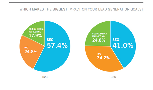 Для B2C-маркетологов значимость SEO чуть менее важна (41%), но более значимыми являются контекстная реклама (34,2%) и маркетинг в социальных сетях (24,8%).