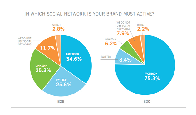 Среди B2B-маркетологов мы можем наблюдать более разнообразную картину того, какие социальные сети задействуются в ходе кампании. B2C-специалисты в большинстве своём (75,3%) отдают предпочтение Facebook.