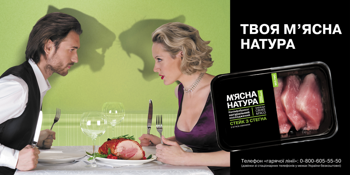 Даже если вы самый заядлый веган, устоять перед продуктами этой торговой марки будет очень непросто! Ведь не зря старалась команда рекламного агентства Euro RSCG Kiev, которая в рамках сотрудничества с крымским брендом охлажденных мясных полуфабрикатов «Мясная натура» разработала ряд креативных материалов, способных открыть настоящую мясную натуру в каждом.