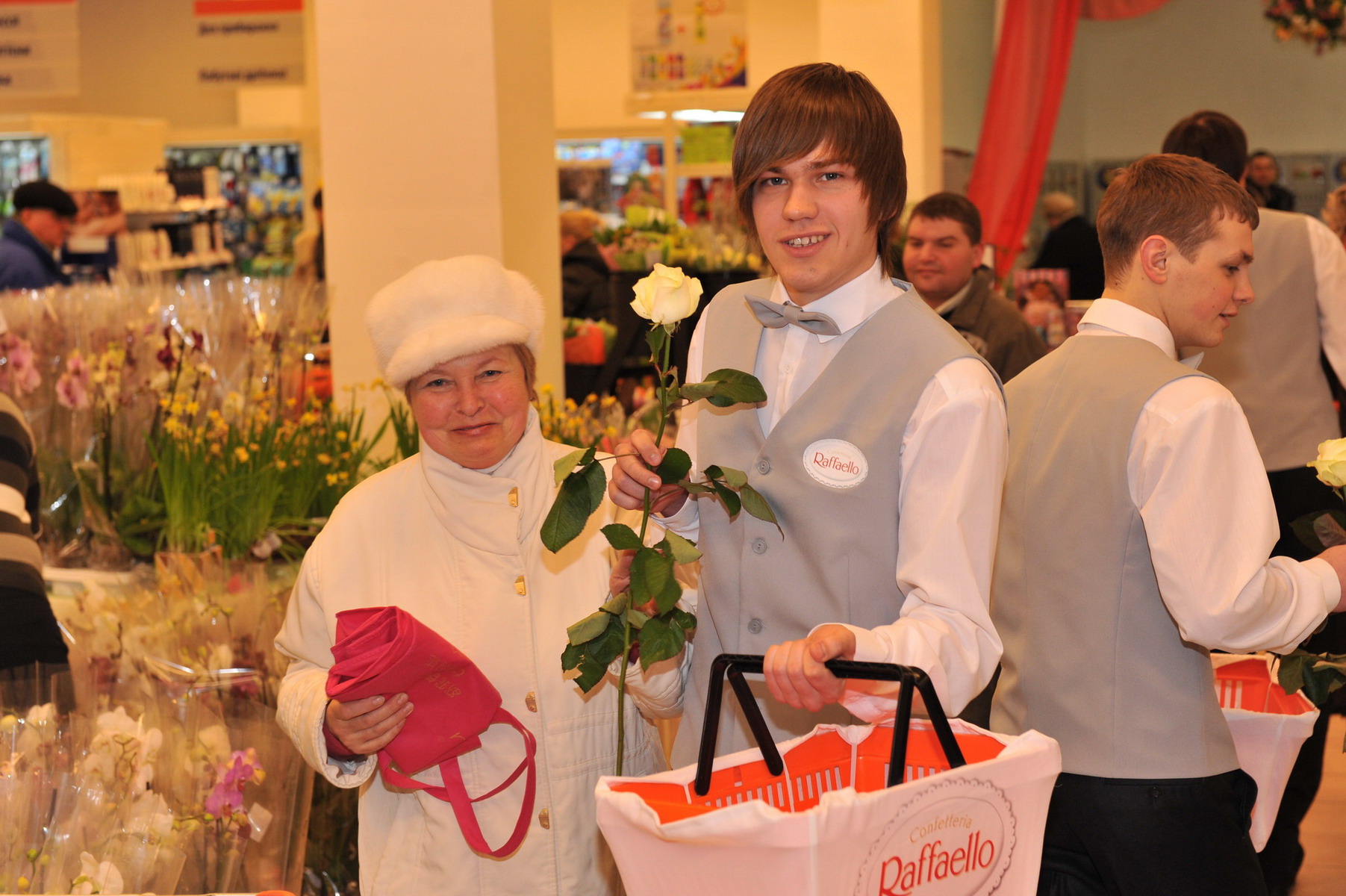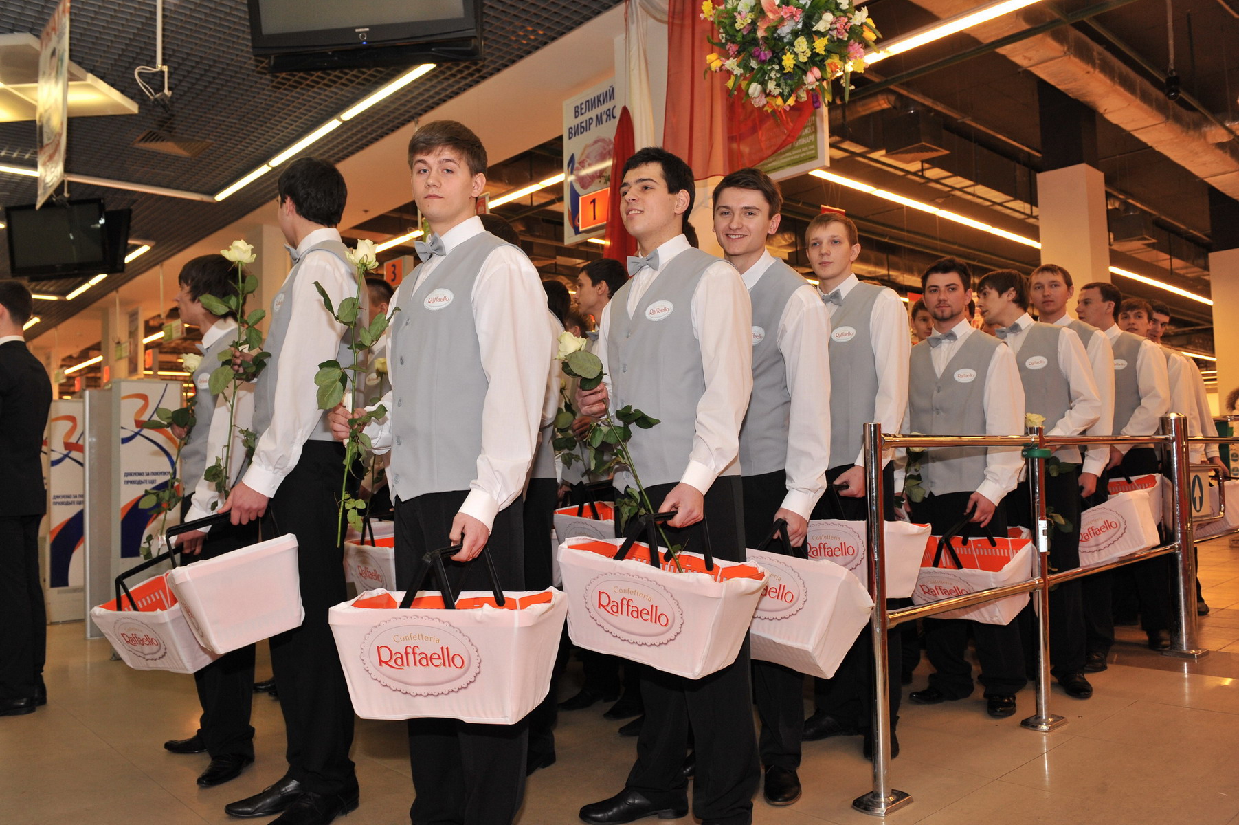7 марта,  с  15:00 до 19:00 более пятидесяти прекрасных юношей встречали каждую посетительницу супермаркета «Сільпо» на Днепровской Набережной,33  и  заботились  о  том,  чтобы  дамы  могли легко и с удовольствием совершить   праздничные  покупки.  Их  задачей  было  сделать  женщине сюрприз,  создать  атмосферу  романтики  и  внимания. То есть, сделать обыденный  поход  за  покупками  приятным  праздником! Мужчины во всем помогали  женщинам  во  время  выбора продуктов в тороговом зале, были вежливыми  и  интересными  собеседниками, сопровождали их до кассы. На прощание  каждая  женщина  получила  от  своего  галантного  помощника подарок  от  ТМ  Raffaello,  цветы  — и, конечно же, комплименты, ведь услышать приятные слова в свой адрес для женщины так важно!