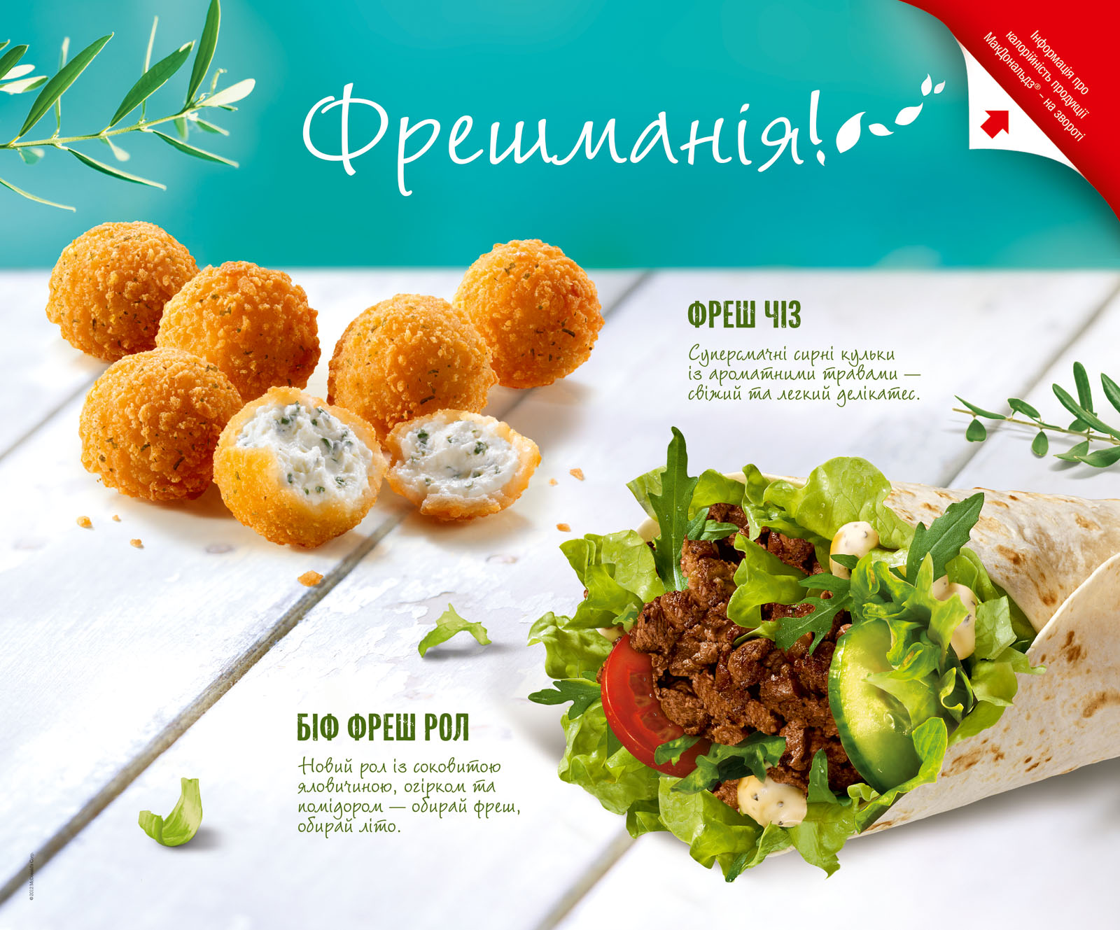 «Мы постоянно расширяем наше меню. Это позволяет нам удовлетворять вкусы еще большего количества посетителей. Новинкой этого лета стал Биф Фреш Ролл, который, в отличие от Биф Рола, не содержит сыра и жареного лука, но содержит помидоры и огурцы. Также мы знаем, что наши посетители желают видеть блюда из творога в нашем меню, поэтому в этом году мы впервые предлагаем нашим гостям сырные шарики Фреш Чиз, которые имеют потенциал стать одним из самых любимых сезонных блюд», - говорит Сергей Братусев, директор по маркетингу МакДональдз в Украине.