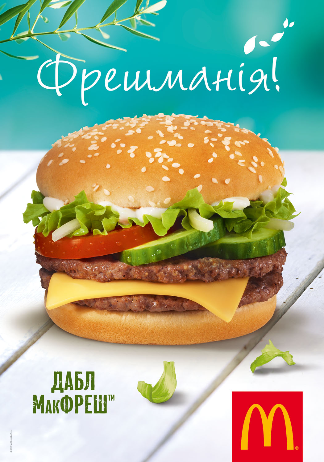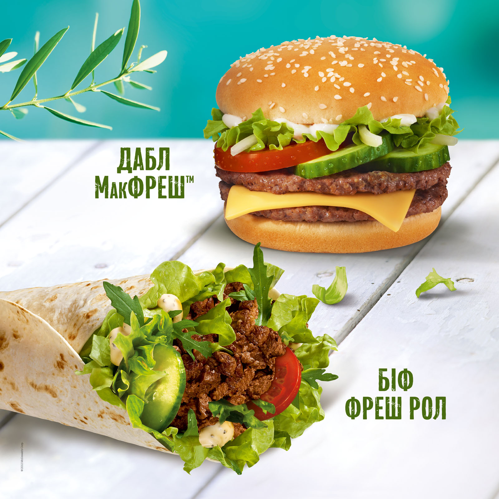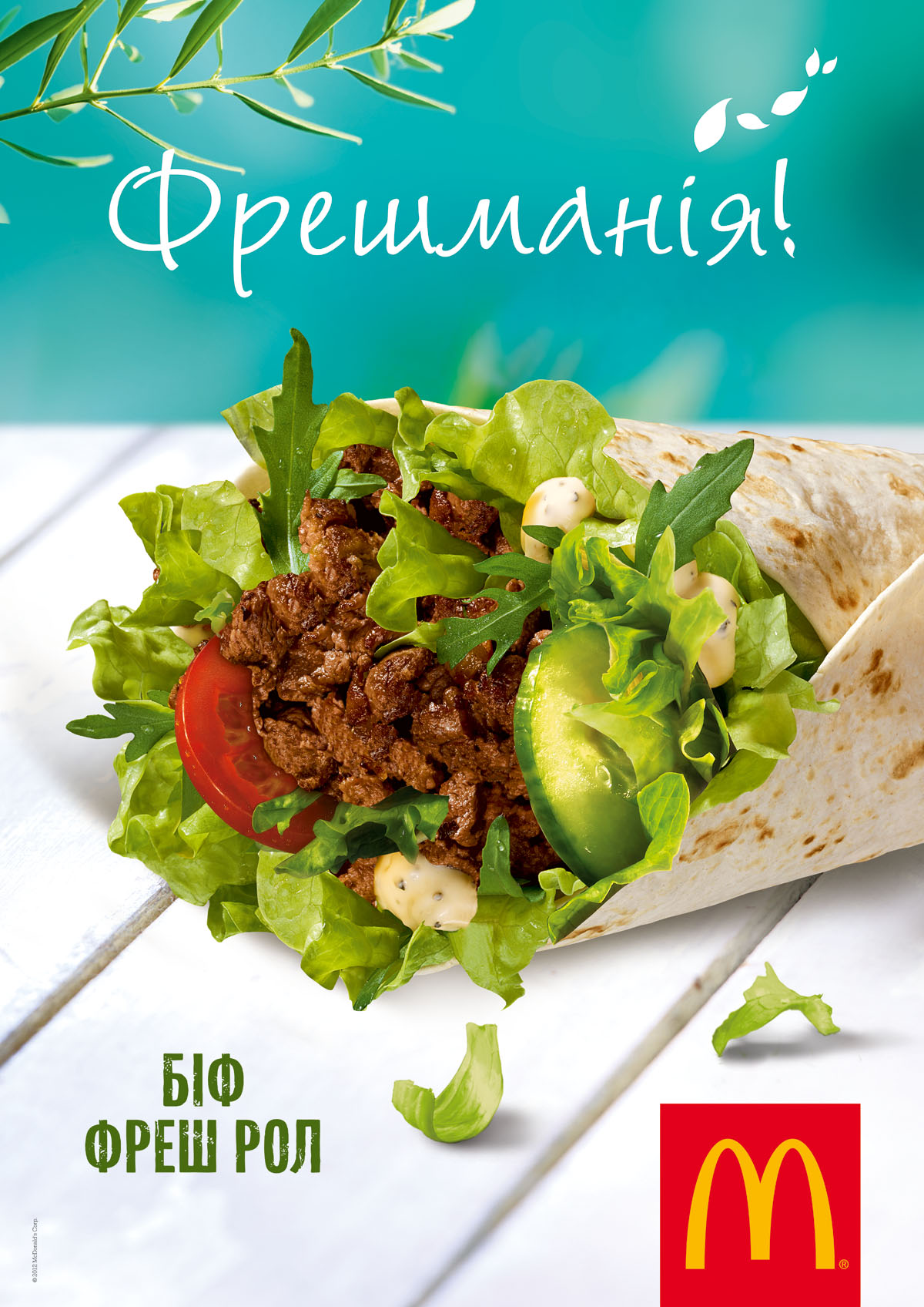 Новый Биф Фреш Ролл с говядиной, помидорами, огурцами и зеленью появился во всех заведениях МакДональдз в Украине 10 июля вместе с другими сезонными блюдами со свежими овощами – сандвичем Дабл МакФреш, Салатом по-гречески и сырными шариками Фреш Чиз.
