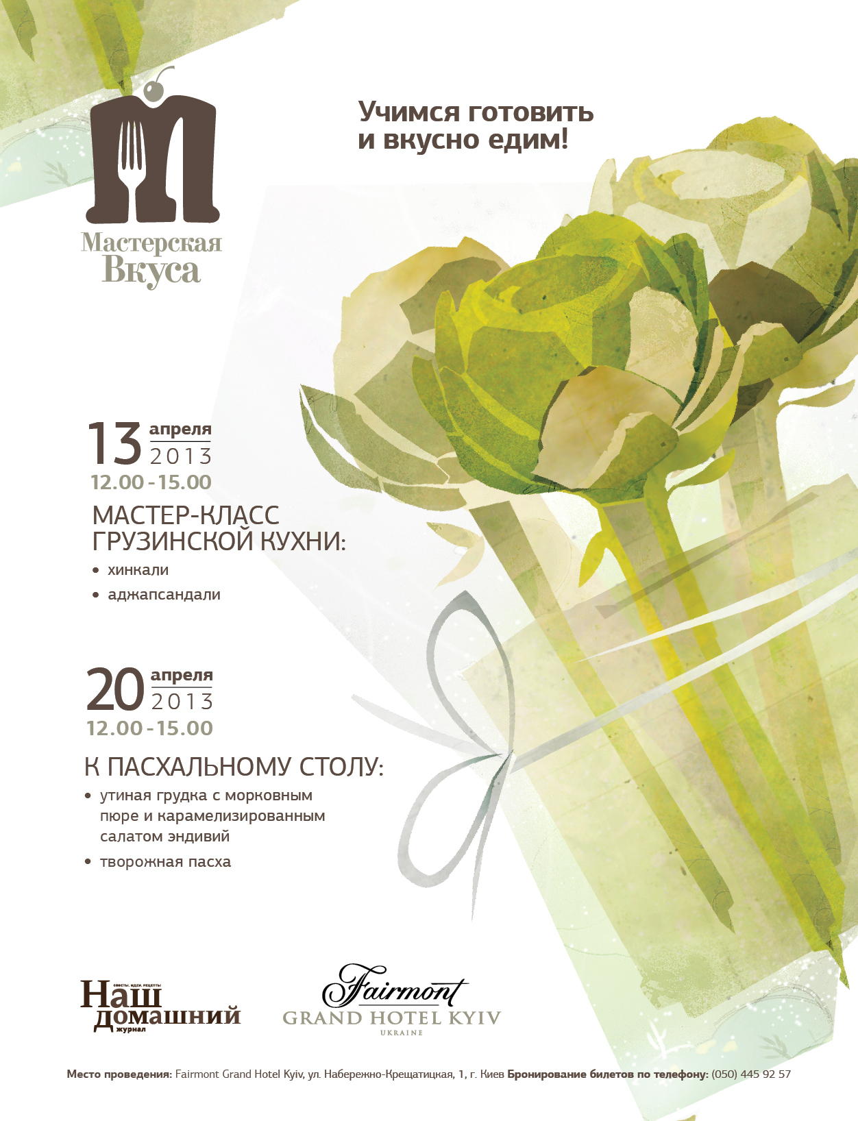 В апреле «Наш домашний журнал» и Fairmont Grand Hotel Kyiv запускают совместный проект – школу «Мастерская вкуса» для кулинаров-любителей. Два раза в месяц шеф-повар Fairmont Grand Hotel Kyiv Шота Годердзишвили будет учить всех желающих готовить блюда кухонь разных стран мира.