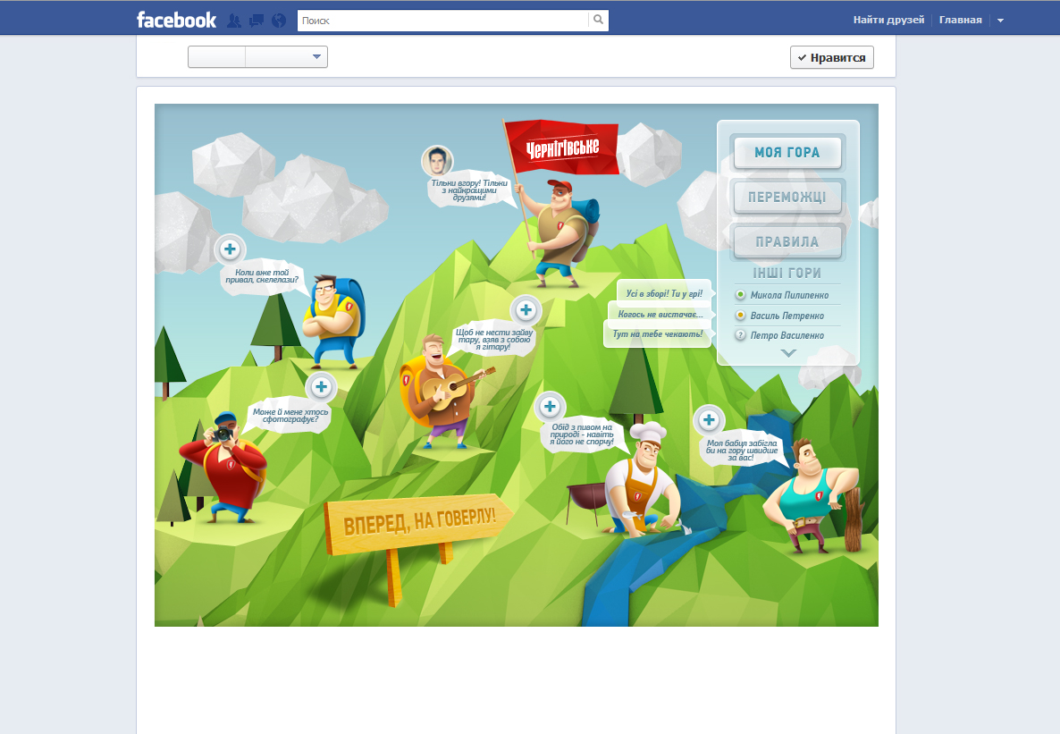 Агентство Prodigi запустило  новое приложение для странички ТМ “Чернігівське” в Facebook.  “Вперед, на Говерлу!” позволяет собрать команду для похода на самую известную и высокую гору в Украине. Из своих друзей нужно выбрать типичных персонажей: повара, фотографа, силача, душу компании и ворчуна. После того, как все участники дадут согласие, команда получает шанс выиграть одну из трех групповых поездок на Говерлу.