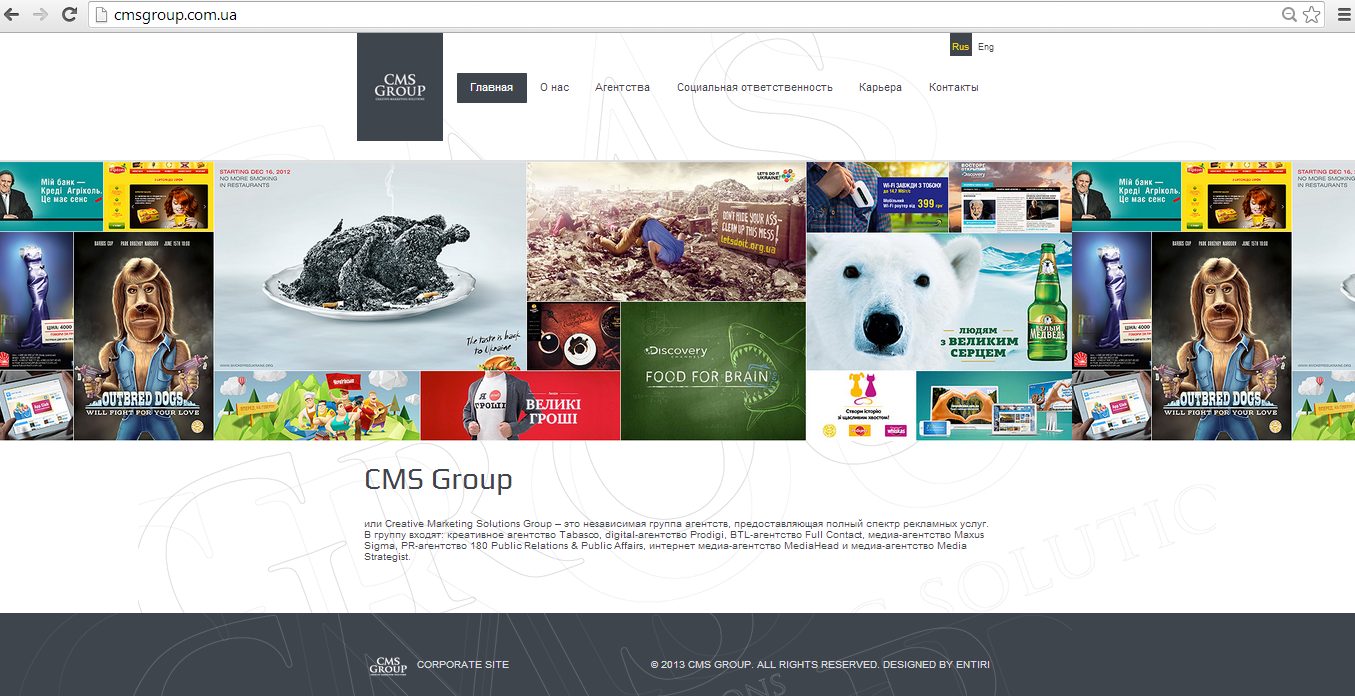 Рекламно-коммуникационный холдинг CMS Group запустил свой сайт: http://cmsgroup.com.ua/, где представлена актуальная информация об истории, миссии, ценностях группы, а также об агентствах, входящих в ее состав, проектах КСО. Также на сайте есть раздел «Карьера», в котором регулярно будут публиковаться и обновляться открытые вакансии агентств CMS Group, а также информация о программах стажировки.
