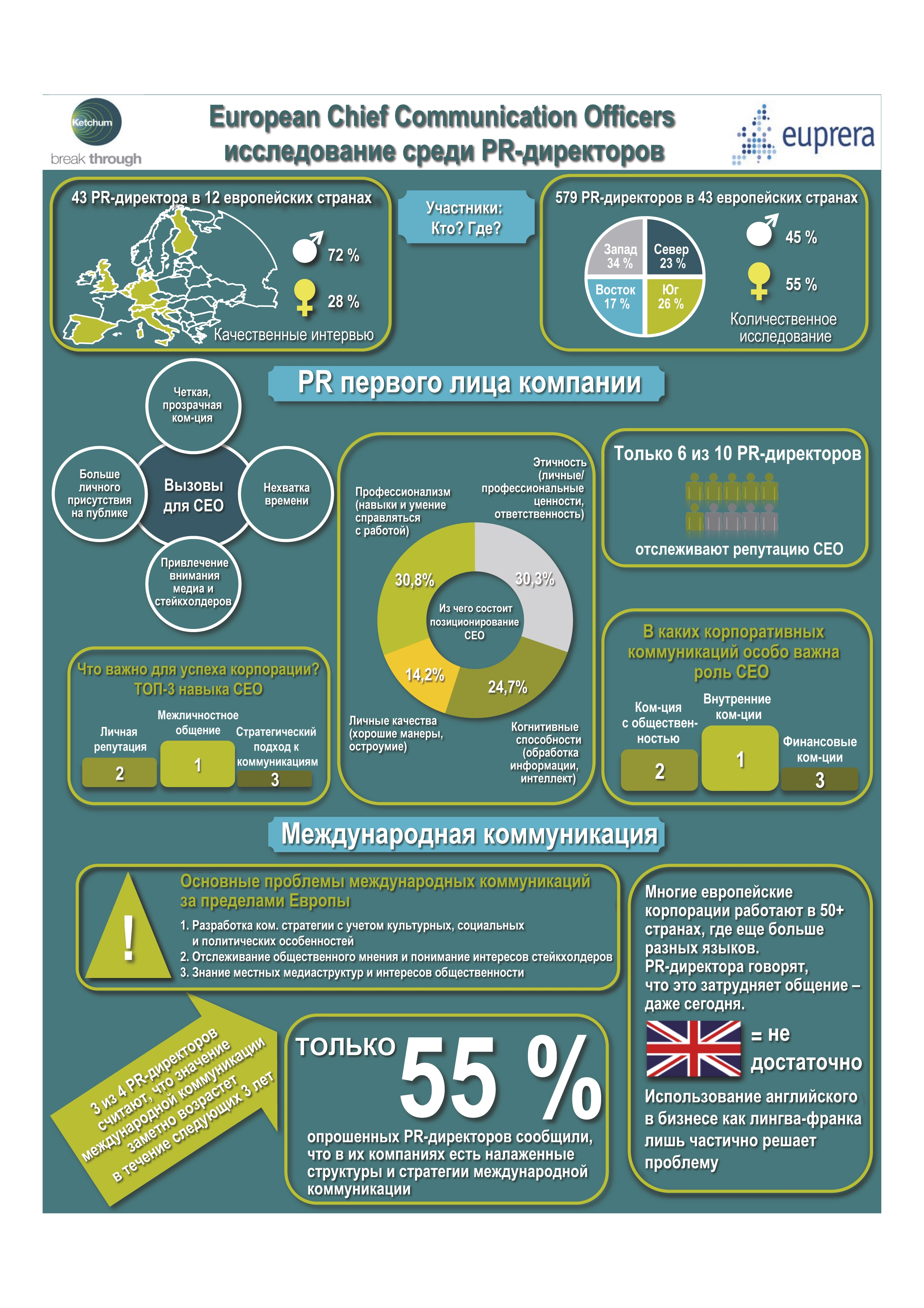 Личность СЕО выходит на первый план. 9 из 10 PR-экспертов утверждают, что успех корпорации зависит от умения руководителя общаться с людьми и его личной репутации. Прозрачная коммуникация, личный пример и признание ошибок – важнейшие аспекты поведения первого лица. Роль СЕО особенно важна во внутренних коммуникациях. Главный упор PR-эксперты делают на профессионализме и этичности руководителя.