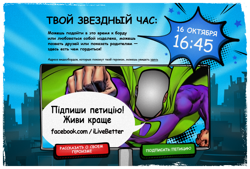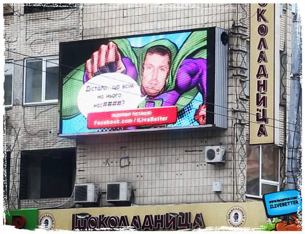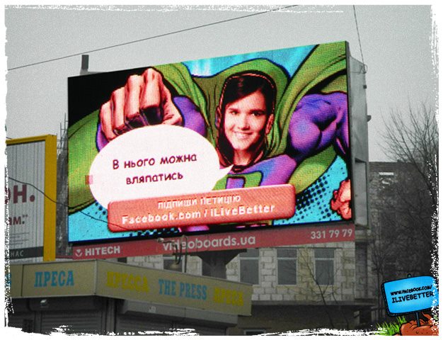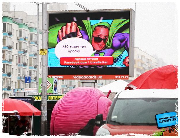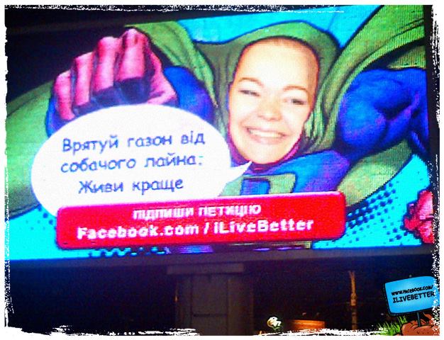 21 ноября в Киеве на 45 видеобордах стартовала необычная кампания. Реальные люди в костюмах супергероев призывают владельцев собак сделать мир лучше, а газон – чище, убрав последствия выгула своих домашних питомцев. Эта кампания – лишь первый этап глобального проекта «Live better» («Живи лучше»), цель которого – изменить окружающую реальность активными действиями.