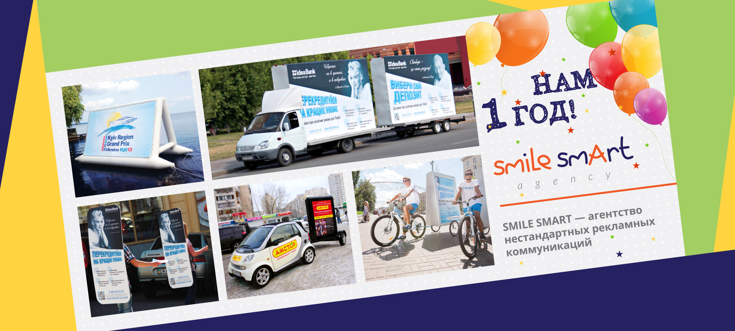 Казалось бы, сегодня на рынке рекламы сложно чем-либо удивить избалованного потребителя, а вот агентству нестандартных рекламных коммуникаций «Smile Smart» это удалось. Ровно год назад группа креативных рекламщиков приняла решение создать агентство нестандартных рекламных носителей. Ставку сделали на брендмобили, ибо в Украине эта отрасль рекламы слабо развита в отличии от Европы и США. Помимо брендмобилей было принято решение запустить и другие нестандартные рекламные носители, которые могут ходить, плавать, летать… Так появились рекламные велосипеды (вело-лайтбокс), плавающие рекламные щиты (aqua-board), ходячие рекламные щиты (A.D. man), и даже самый длинный в Украине передвижной билборд (XXL Long GAZell).