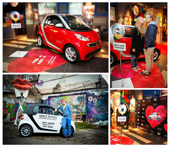 Агентство обеспечило широкую digital и offline-поддержку: во время кампании задействовали рекламу перед фильмом, на ЖК-экранах в кинотеатре, на билетах, наружную рекламу; брендировали «места для поцелуев» в кинозале и вебсайт кинотеатра; разыграли билеты на страницах бренда и кинотеатра в социальных сетях; привлекли знаменитостей и СМИ во время премьер… и попали на ТВ, не заплатив за это ни копейки! А чтобы подчеркнуть одно из преимуществ smart fortwo, а именно компактность и возможность припарковаться в самых невероятных местах (таких, как дверной проём кинотеатра!), мы припарковали его прямо в холле здания!