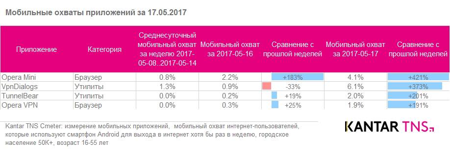 В прошлом году Kantar TNS CMeter, начали измерять аудиторию мобильных приложений. Сравнение среднесуточных охватов до новости и в первые дни после показало, значительный рост охвата Play Market, т.к. пользователи бросились искать альтернативные способы использовать дальше свои приложения, в частности специальные программы VPN и защищенные браузеры.