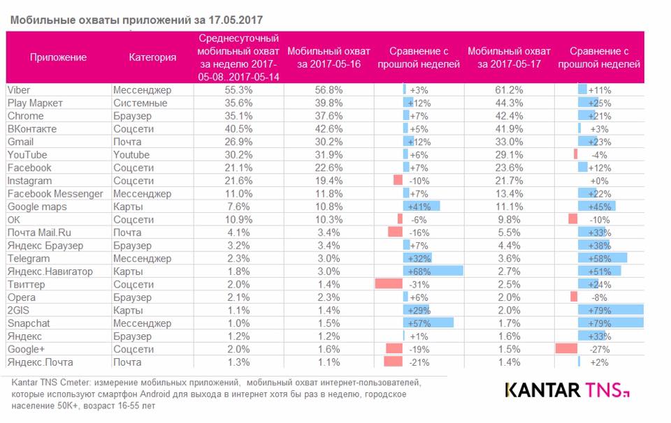 «Поведение пользователя на смартфоне отличается от десктопа. Если не считать системных функций - звонки, галереи, настройки и прочее, то топ приложений был достаточно стабильным - мессенджеры, социальные сети, YouTube, браузеры, почтовые сервисы. В частности, приложение Вконтакте было самым популярным из соц.сетей и оно не теряет сильно свои охваты состоянием на 17.05.2017.» - комментирует ситуацию Анна Шахдинарян, руководитель проекта интернет-исследований Kantar TNS CMeter.