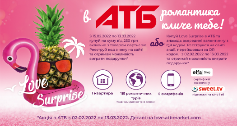 На початку лютого в мережі магазинів АТБ стартувала акція LOVE Surprise, яка настільки сподобалась споживачам, що стала ще більшою! Ще більше романтики та подарунків і ще більше можливостей для споживачів мережі.