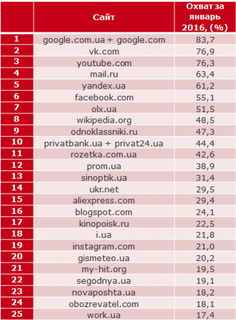 2017 год для рейтинга популярных сайтов начался без изменений в лидерах. Google.com+Google.com.ua, Vk.com, Youtube.com, Mail.ru и Yandex.ua - вот первая пятерка январского ТОПа сайтов, такие данные интернет-исследования KANTAR TNS CMeter.