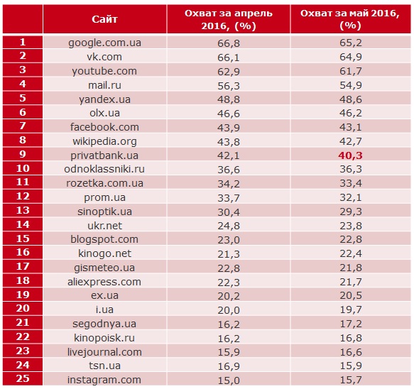 В первые 25 сайтов ворвался Instagram.com с охватом 15,7%, а также Livejournal.com (16,6%), и выпали Aukro.ua с Novaposhta.ua.