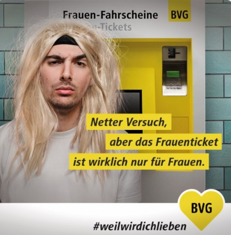 18 марта 2019 года, на протяжении всего дня, действовал специальный «женский» дневной билет BVG. Стоимость этого билета была на 21% ниже стандартной стоимости проезда, таким образом «уравнивая» финансовое положение женщин.